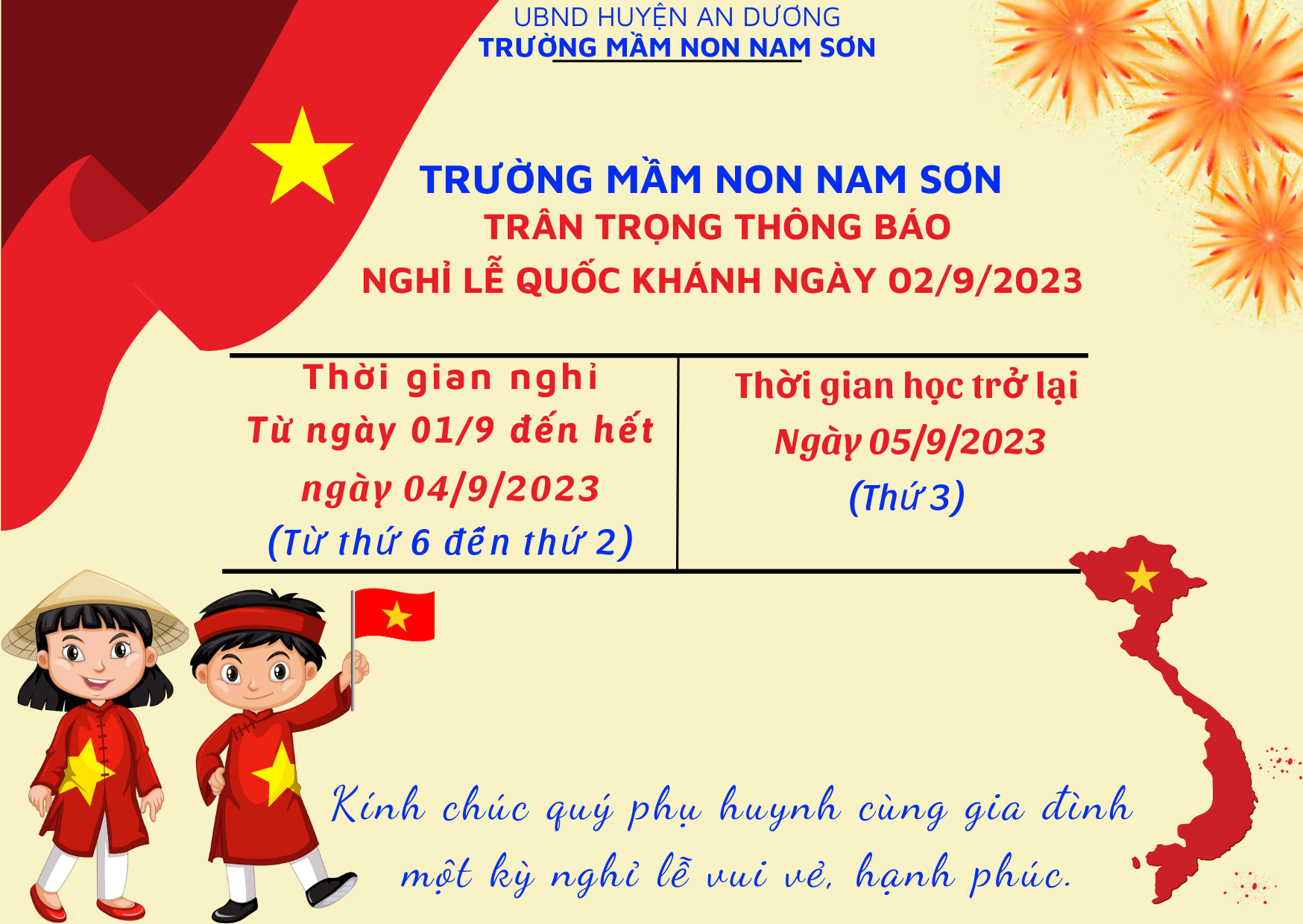 Nhân dịp Quốc Khánh 2/9, trường mầm non Nam Sơn kính chúc Quý phụ huynh cùng gia đình có một kì nghỉ lễ thật vui vẻ, hạnh phúc. Trân trọng cảm ơn!